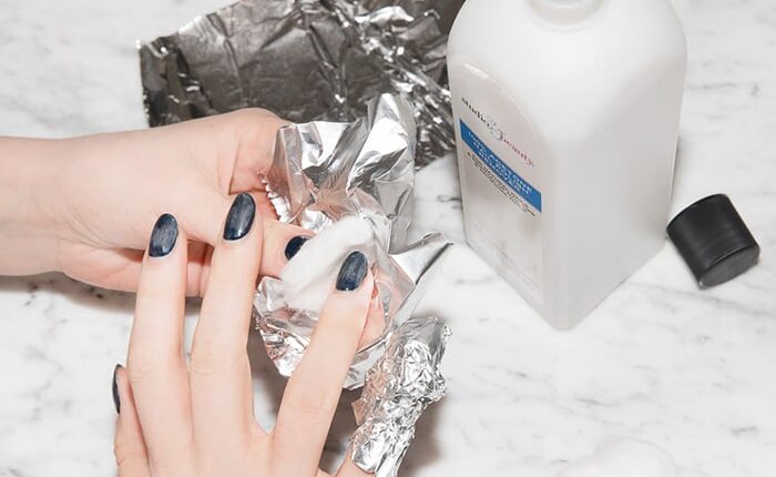 - پوشاندن ناخن با فویل: پنبه آغشته به استون را روی ناخن خود قرار دهید و برای جلوگیری از تبخیر استون و ثابت ماندن پنبه، هر انگشت را با یک تکه فویل آلومینیومی به خوبی بپوشانید.