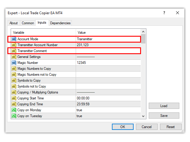 - Synchronized Trade Closure: True/false для опции мгновенного закрытия всех скопированных сделок, открытых советником на счете(ах) получателя, сразу после закрытия исходных сделок на счете(ах) отправителя.