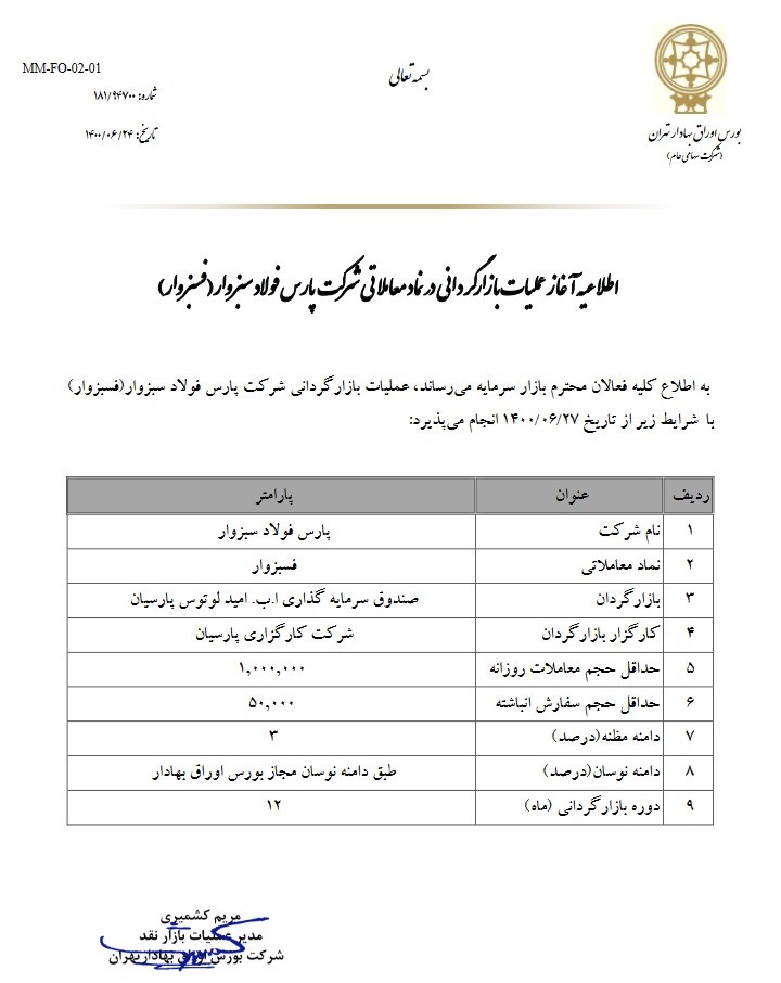 براساس این اطلاعیه، بازارگردان نماد یادشده، صندوق سرمایهگذاری ا.ب. امید لوتوس پارسیان و کارگزار بازارگردان، شرکت کارگزاری پارسیان معرفی شدهاند.