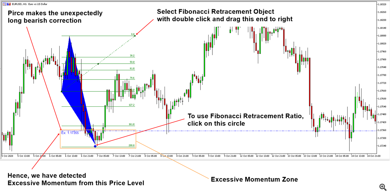 علاوه بر این، سطح اصلاح فیبوناچی می تواند ایده بیشتری در مورد اینکه چه زمانی قیمت می تواند مطابق انتظار ما حرکت کند، ارائه دهد. برای فراخوانی خودکار سطح اصلاح فیبوناچی، کافی است روی دایره در ناحیه حرکت بیش از حد کلیک کنید. سپس سطح اصلاح فیبوناچی را به طور خودکار در نمودار شما قرار می دهد. مسئله این است که سطح Fibonacci Retracement قرار داده شده ممکن است از نظر عرض بسیار کوتاه باشد. گاهی اوقات، شما می خواهید سطح Fibonacci Retracement را در سمت راست پیش بینی کنید تا عمل قیمت را در اطراف سطح اصلاح مشاهده کنید. انجام شدنی هم هست