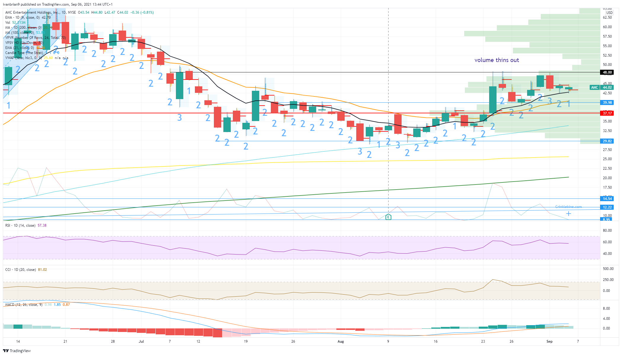 AMC تا کنون سطح شکست را در 40 دلار نگه داشته است و دوباره برای آزمایش مجدد آن بازگشته است. تا کنون خیلی خوب. اما برای پیشروی در سطح بعدی شکست 48 دلار است و برای پیشرفت در اینجا زمان بر است. سهام AMC تا به حال 2 بار برای شکستن 48 دلار تلاش کرده است ، آیا برای سومین بار خوش شانس خواهد بود؟ تریدز مطمئناً اینطور فکر می کند اما از قانون 4 استفاده می کند! خوب ، 3 یا 4 ما خیلی سر و صدا نداریم اما AMC باید 48 دلار به زودی خرج کند تا حرکت را ادامه دهد.
