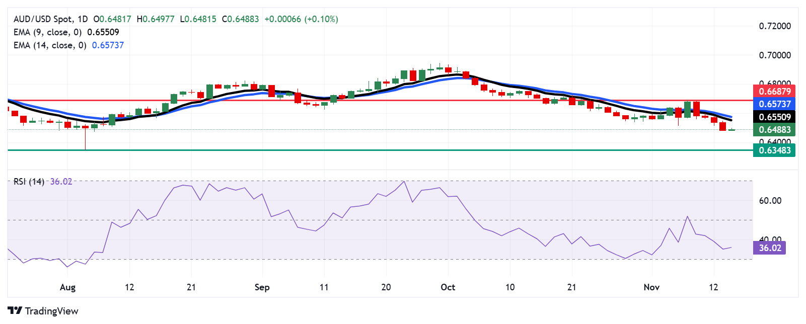 جفت AUD/USD در روز پنجشنبه نزدیک به 0.6490 معامله می شود. تجزیه و تحلیل نمودار روزانه نشان‌دهنده فشار نزولی کوتاه‌مدت است که این جفت در زیر میانگین متحرک نمایی ۹ روزه (EMA) باقی مانده است. علاوه بر این، شاخص قدرت نسبی 14 روزه (RSI) زیر علامت 50 است و چشم انداز نزولی را تقویت می کند.