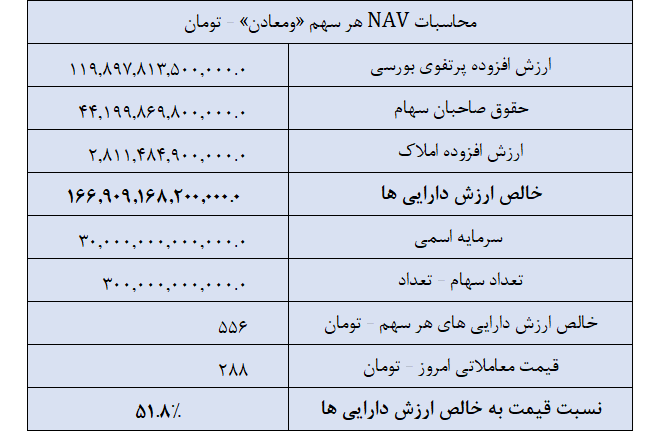 با توجه به سرمایه اسمی ۳۰ همتی، خالص ارزش داراییهای متعلق به هر سهم برابر با ۵۵۶ تومان محاسبه شده! حال آنکه قیمت معاملاتی تابلو برابر با ۲۸۸ تومان است! یعنی نسبت P/NAV هر سهم «ومعادن» برابر با ۵۱.۸% است!