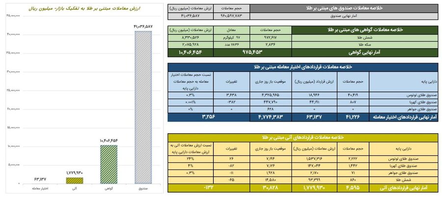 همچنین ۴ هزار و ۵۹۵ قراردادآتی مبتنی بر طلا به ارزش ۱۷۷ میلیارد تومان منعقد شد.