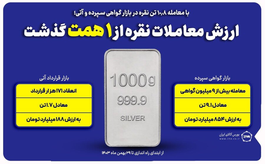 به گزارش پایگاه خبری بازار سرمایه ایران (سنا)، بازار معاملات شمش نقره (در بازارهای مالی و مشتقه بورس کالای ایران) رکورد جدیدی را به ثبت رساند، با گذشت نزدیک به سه ماه از راه اندازی این بازار، مجموع ارزش معاملات آن یک همتی شد.
