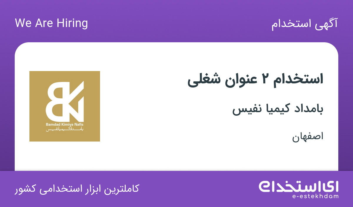 بامداد کیمیا نفیس جهت تکمیل کادر خود در استان اصفهان از افراد واجد شرایط زیر دعوت به همکاری می نماید.