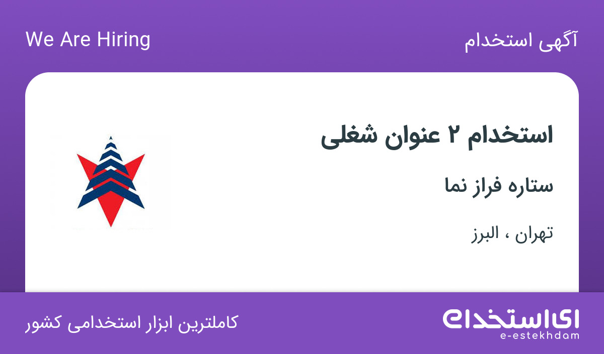 شرکت معتبر ستاره فراز نما، فعال در زمینه ی تولید قطعات آسانسور جهت تکمیل کادر خود در استان های تهران و البرز از افراد واجد شرایط زیر دعوت به همکاری مینماید.