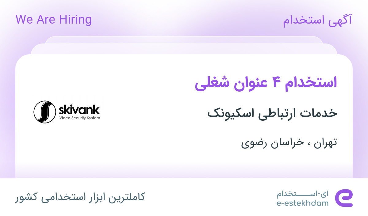 شرکت اسکیونک طراح و مجری سیستم های امنیتی و نظارت تصویری فعالیت خود را از سال 1373 در زمینه نصب و اه اندازی سیستم دوربین های مداربسته آغاز نموده و در طول این مدت بیش از 3000 پروژه بزرگ دولتی در سراسر کشور و خارج کشور به انجام رسانیده است ، در راستای تکمیل کادر فنی و فروش در استانهای تهران (شهر تهران) و خراسان رضوی (شهر مشهد) از افراد واجد شرایط زیر دعوت به همکاری می نماید.