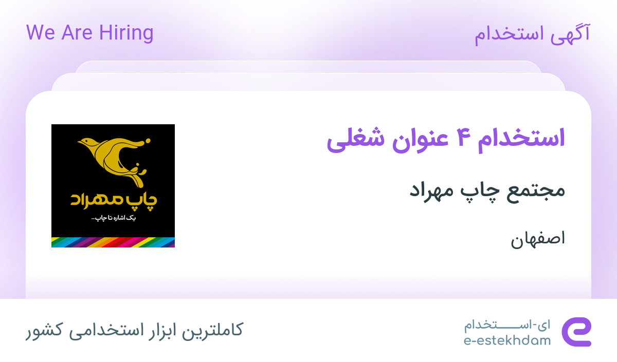 مجتمع صنعتی چاپ مهراد با 20 سال سابقه کار، جهت تکمیل کادر خود در استان اصفهان از افراد واجد شرایط زیر دعوت به همکاری مینماید.