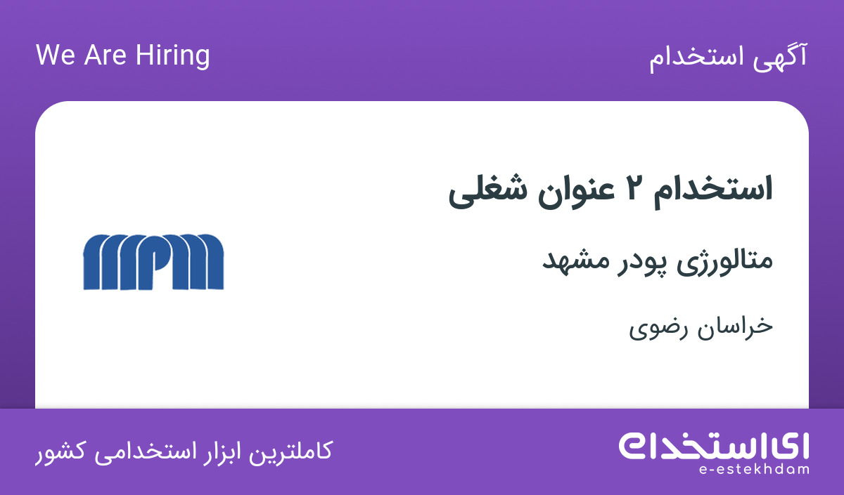 متالورژی پودر مشهد جهت تکمیل کادر خود در استان خراسان رضوی از افراد واجد شرایط زیر دعوت به همکاری می نماید.