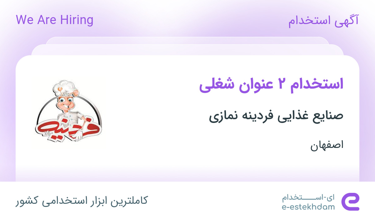صنایع غذایی فردینه نمازی جهت تکمیل کادر خود در استان‌ اصفهان از افراد واجد شرایط زیر دعوت به همکاری می‌نماید.