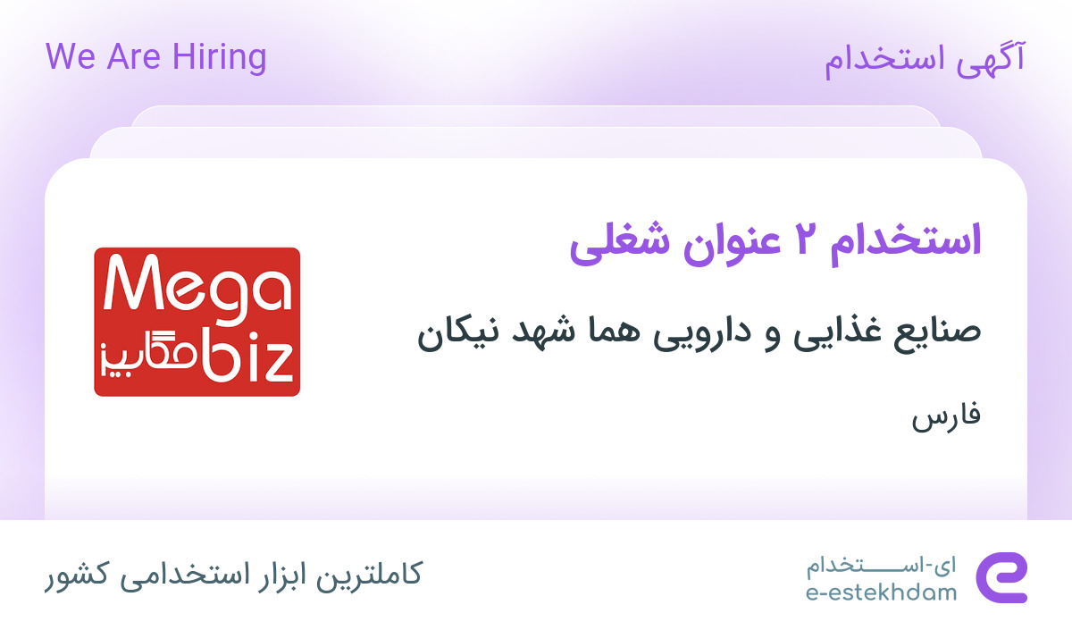 صنایع غذایی و دارویی هما شهد نیکان جهت تکمیل کادر خود در استان فارس از افراد واجد شرایط زیر دعوت به همکاری می نماید.