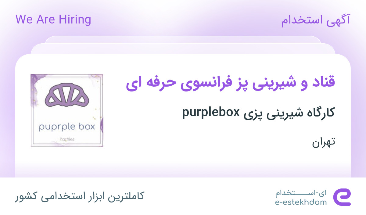 استخدام کارگاه شیرینی پزی purpleboxکارگاه شیرینی پزی Purplebox در تهران (منطقه 3، زرگنده) جهت تکمیل کادر خود از متقاضیان ساکن استان تهران استخدام مینماید.