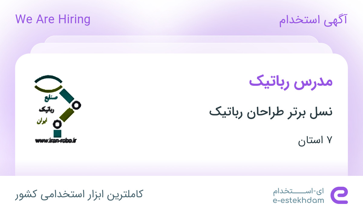 نسل برتر طراحان رباتیک جهت تکمیل کادر خود در استان های تهران، اصفهان، البرز، فارس، قم، گیلان و مازندران از افراد واجد شرایط زیر دعوت به همکاری می نماید.