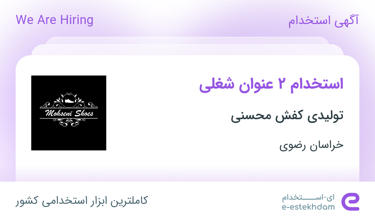 شرکت تولیدی کفش محسنی با 15 سال سابقه فعالیت جهت تکمیل کادر خود در استان خراسان رضوی از افراد واجد شرایط زیر دعوت به همکاری مینماید.
