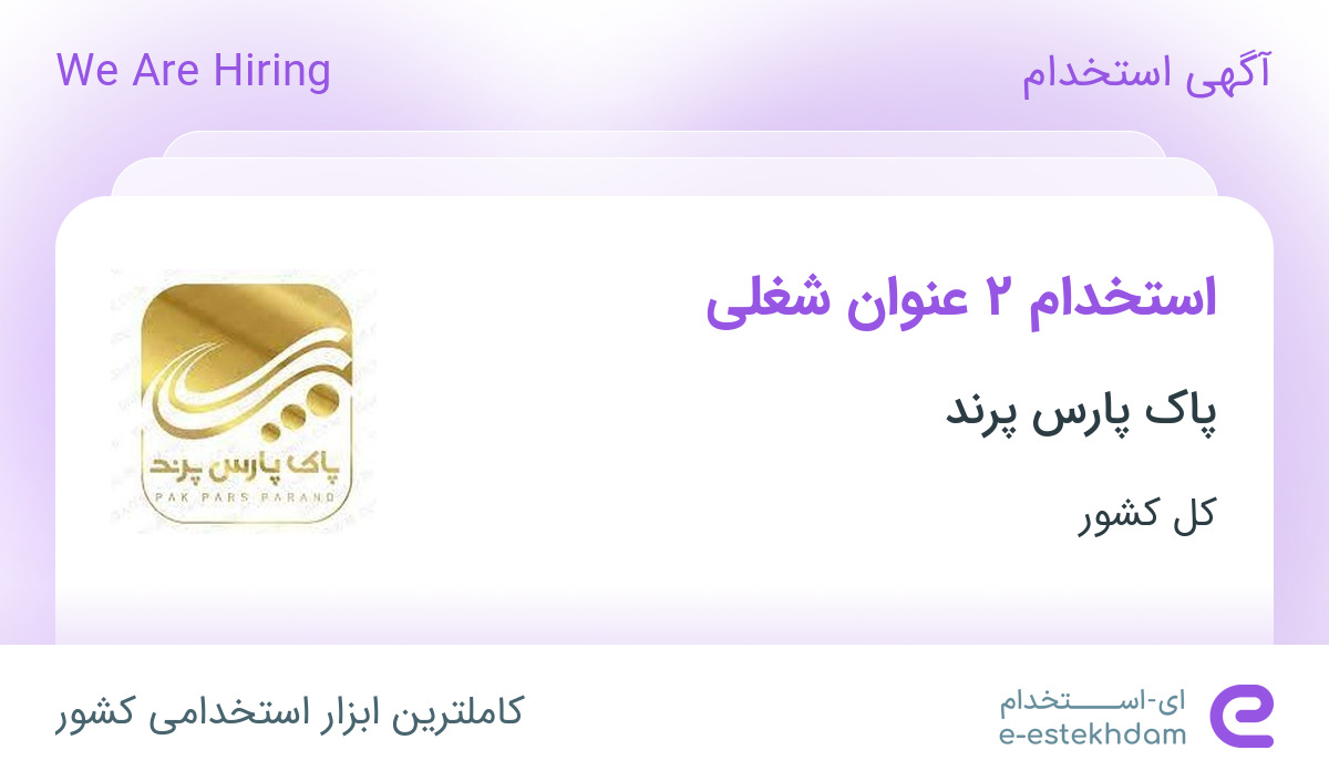 پاک پارس پرند جهت تکمیل کادر خود در کل کشور از افراد واجد شرایط زیر دعوت به همکاری می نماید.