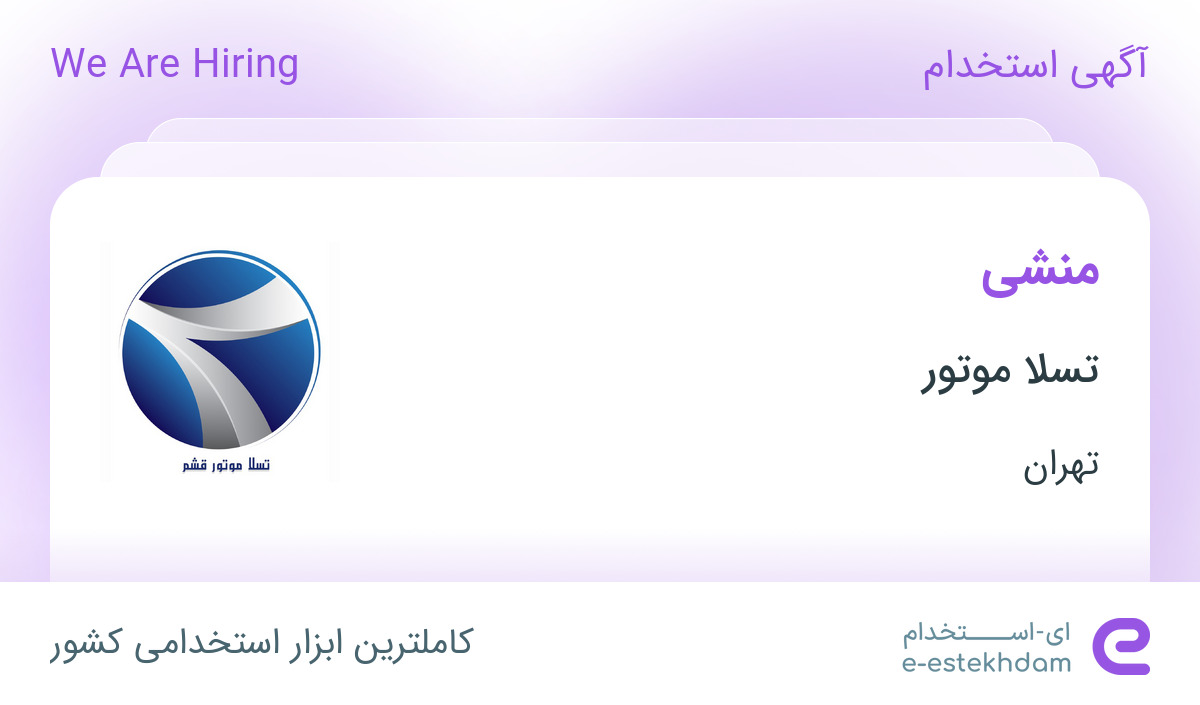 شرکت تسلا موتور جهت تکمیل کادر خود در استان تهران از افراد واجد شرایط زیر دعوت به همکاری می نماید.