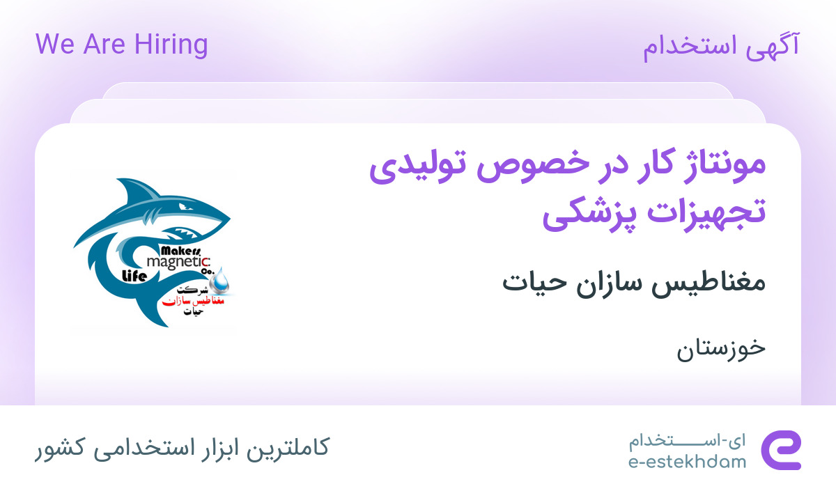 استخدام مغناطیس سازان حیاتشرکت مغناطیس سازان حیات جهت تکمیل کادر تولیدی خود، در شهر اهواز منطقه گلستان، از افراد واجد شرایط زیر دعوت به همکاری مینماید.