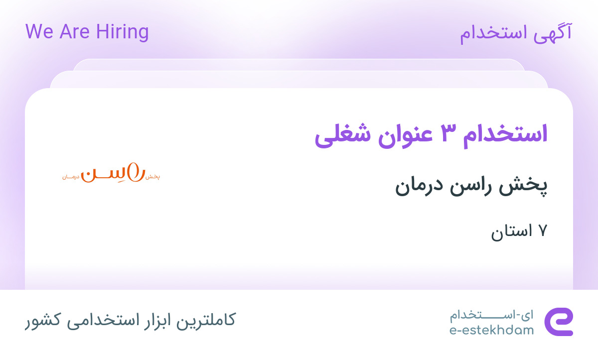 پخش راسن درمان جهت تکمیل کادر خود در استان های تهران، اصفهان، خراسان رضوی، فارس، سیستان و بلوچستان، قم و مازندران از افراد واجد شرایط زیر دعوت به همکاری می نماید.
