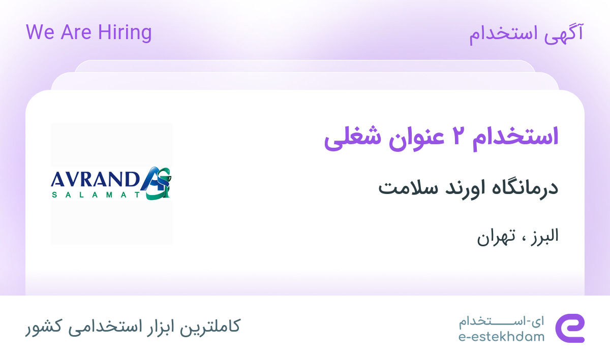 درمانگاه اورند سلامت جهت تکمیل کادر خود در استان البرز و استان تهران از افراد واجد شرایط زیر دعوت به همکاری مینماید.