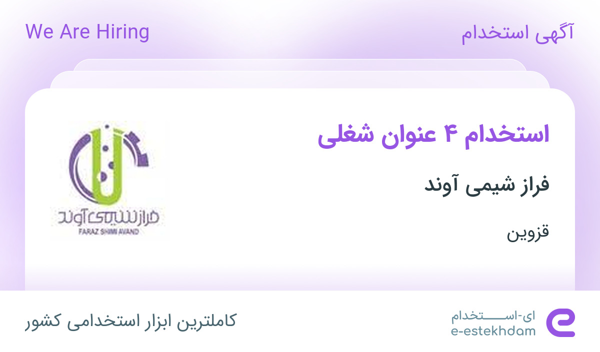 شرکت فراز شیمی آوند واقع در تاکستان جهت تکمیل کادر خود در استان قزوین، شهرک صنعتی خرمدشت از افراد واجد شرایط زیر دعوت به همکاری مینماید.