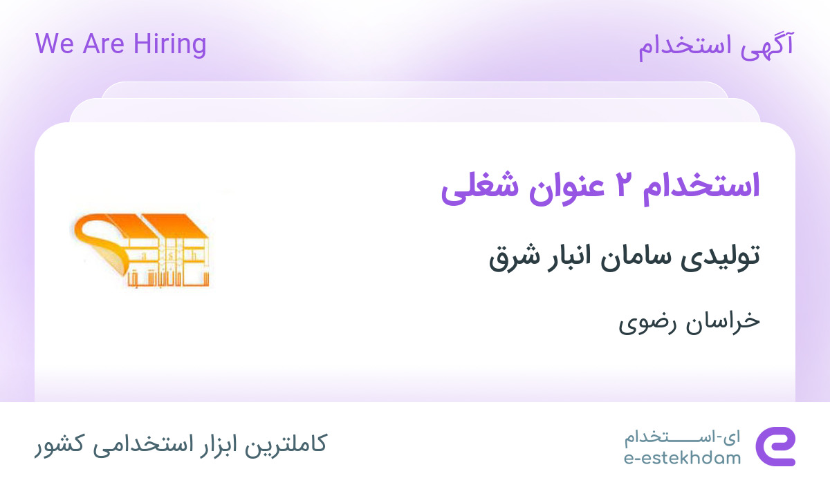 شرکت تولیدی سامان انبار شرق جهت تکمیل کادر اداری خود در استان خراسان رضوی، مشهد (شهرک صنعتی کلات) از افراد واجد شرایط زیر دعوت به همکاری مینماید.