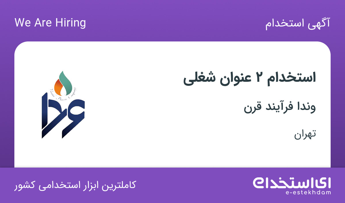 شرکت بازرگانی وندا فرآیند قرن (زمینه کاری صنعت نفت، گاز، پتروشیمی و فولاد) جهت تکمیل پرسنل خود از متقاضیان ساکن استان تهران با حقوق و شرایط مکفی استخدام می نماید.
