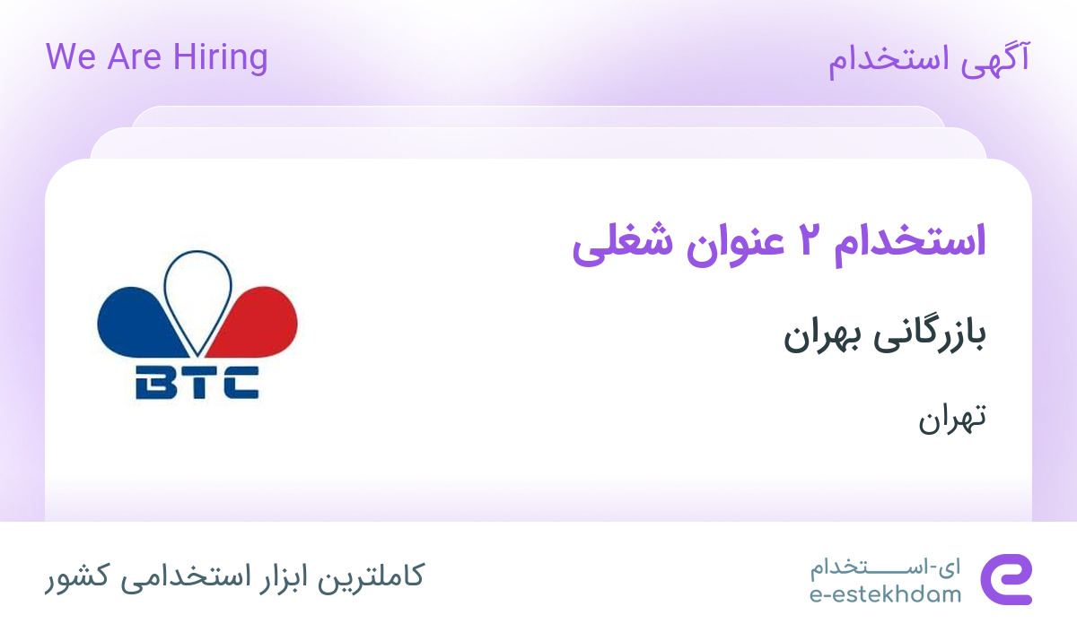 شرکت بازرگانی بهران (سهامی خاص)، به منظور تامین بخشی از نیروی انسانی مورد نیاز خود در شهر تهران از افراد متخصص، متعهد و با انگیزه از طریق مصاحبه عمومی، تخصصی و سنجش سلامت به صورت قرارداد کار مدت معین بصورت پیمانکاری با شرایط ذیل دعوت به همکاری می نماید.