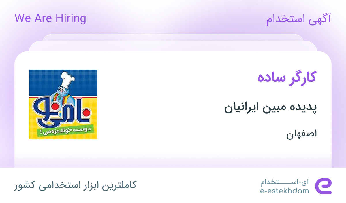 استخدام پدیده مبین ایرانیانشرکت پدیده مبین ایرانیان (نامی نو) جهت تکمیل کادر نیروی کارگری خود در استان اصفهان از افراد واجد شرایط زیر دعوت به همکاری می‌نماید.