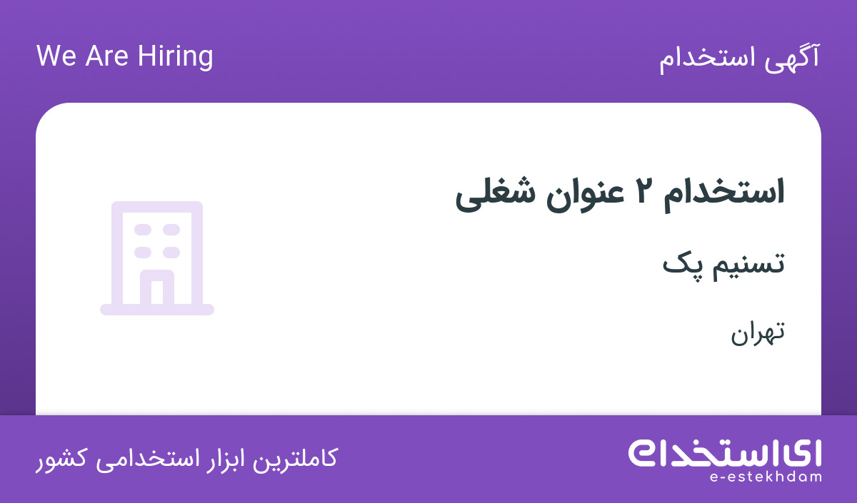 تسنیم پک جهت تکمیل کادر خود در استان تهران از افراد واجد شرایط زیر دعوت به همکاری می نماید.