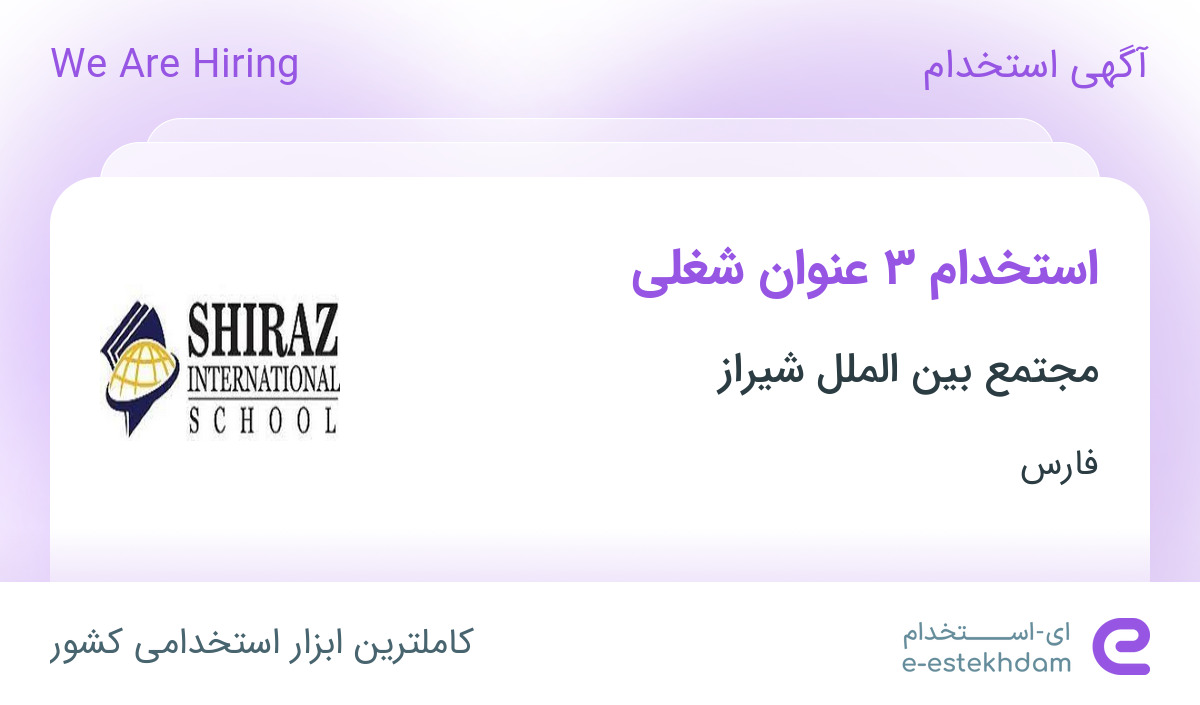 [ad_1] استخدام مجتمع بین الملل شیراز مجتمع آموزشی بین الملل شیراز (Shiraz International School) جهت تکمیل کادر آموزشی خود از افراد کارآزموده، حرفه ای، علاقه مند به کار با کودکان و نوجوانان، دارای تحصیلات لیسانس و یا بالاتر به صورت تمام وقت یا پاره وقت در ردیف های شغلی زیر در استان فارس دعوت به