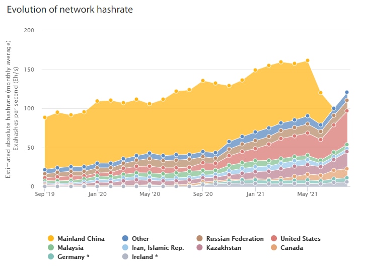 گزارش جدید مرکز کمبریج برای امور مالی جایگزین (CCAF) اکنون تأیید می کند که از زمان ممنوعیت چین ، معدنچیان خارج از منطقه ، عمدتا از ایالات متحده ، عملیات استخراج جهانی بیت کوین را به عهده گرفته اند. ایالات متحده آمریکا تا پایان آگوست 35.4 درصد از هش ریت جهانی را به خود اختصاص داده است که از 16.8 درصد در پایان آوریل بیش از دو برابر شده است.