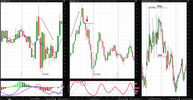 اجازه دهید از یک صفحه سه گانه در معاملات فارکس با جفت ارز EUR/USD به عنوان مثال استفاده کنیم. این صفحه نمایشی است که برای شناسایی روند غالب در دارایی و تصمیم گیری در جهت انجام معامله استفاده می شود.
