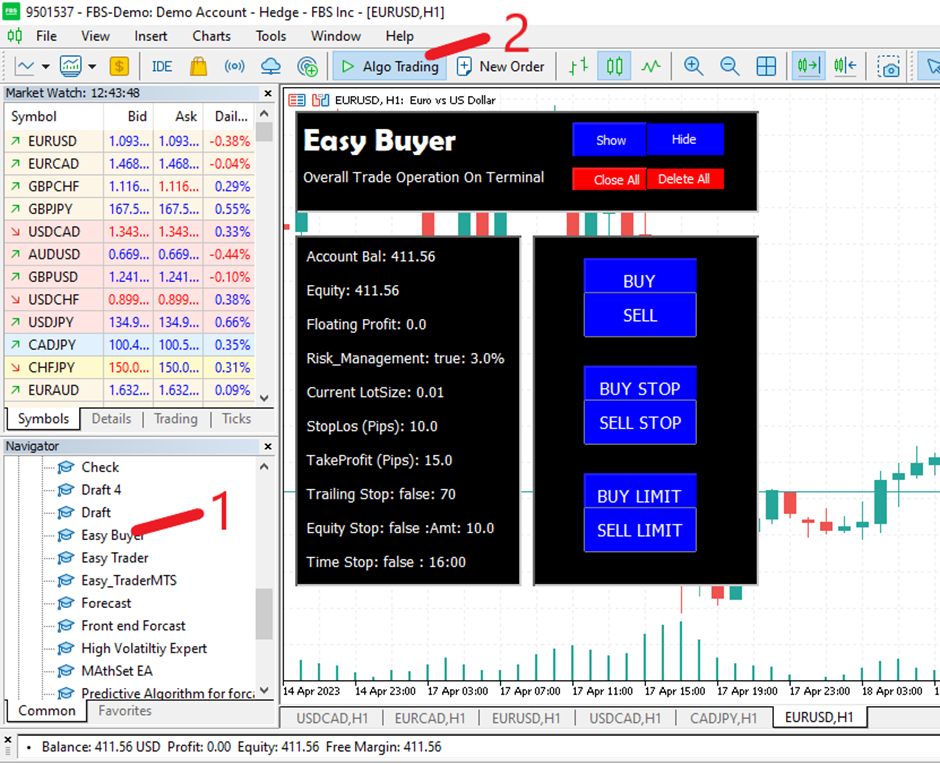 Easy Buyer را روی نمودار بکشید و رها کنید و Algo Trading را روشن کنید.