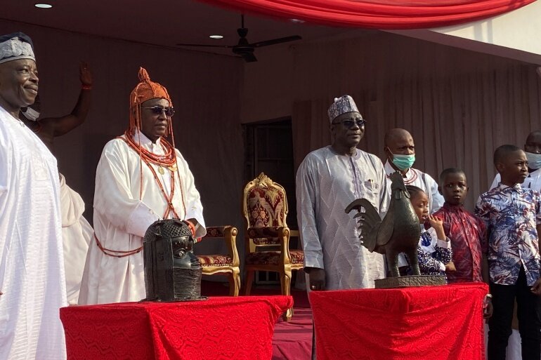 نماینده کاخ «اوبا» در مراسمی که برای استرداد دو مجسمه برنز که یکی به شکل خروس و دیگری به شکل پادشاه ساخته شده است حضور داشت. او در این مراسم به این نکته اشاره کرد که برخی از این مجسمهها در کشورهایی همچون نیوزیلند، ایالات متحده آمریکا و ژاپن نیز نگهداری میشوند.
