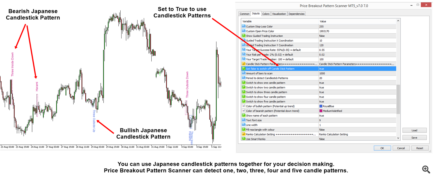 اسکنر الگوی شکست قیمت چندین سیستم معاملاتی را در یک محصول ترکیب می کند. اگر به درستی استفاده شوند، می توانند نتایج معاملاتی عالی داشته باشند. یکی از سیستم های معاملاتی ساخته شده در اسکنر الگوی برک آوت قیمت، الگوهای شمعدانی ژاپنی است. اسکنر الگوی شکست قیمت می تواند 52 الگوی مختلف شمعدان ژاپنی را تشخیص دهد. آنها در پنج دسته شامل یک، دو، سه، چهار و پنج الگوی شمعدانی دسته بندی می شوند.