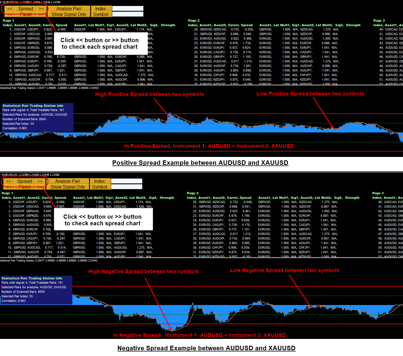 در اینجا راهنمای مختصری در مورد نحوه تفسیر نمودار گسترش است. در این مثال، ما از AUDUSD و XAUUSD به عنوان دارایی 1 و دارایی 2 استفاده می کنیم. مقدار مطلق این دو دارایی به معنای عادی شده برای مقایسه سیب با سیب و گلابی با گلابی مقایسه می شود. دو مورد شامل اسپرد مثبت و اسپرد منفی وجود دارد.