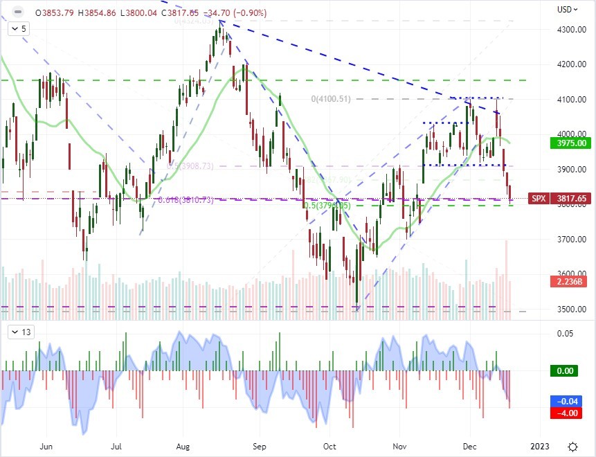 ما به طور تصادفی وارد آخرین هفته کامل نقدینگی برای سال تجاری شده ایم. دوره کوتاه تعطیلات هفته آینده بین کریسمس و سال نو به دلیل تخلیه آن در کشش حدس و گمان بدنام است. با این حال، ما هنوز پتانسیل‌هایی را در بازارها داریم قبل از اینکه شاهد محو شدن در این آخر هفته باشیم. در حالی که هنوز مسائل سیستمی وجود دارد که روندهای رو به جلو را تا سال 2023 منتقل می کند (مانند وضعیت سیاست پولی و نگرانی های مربوط به رکود)، به احتمال زیاد حفظ بازار در این زمینه بدون ریسک رویداد یا تحولات قطعی برای گرم نگه داشتن موتور سفته بازی بسیار دشوار خواهد بود. . اگر واقعاً چنین باشد، حملات نوساناتی که از منابع بنیادی یا فنی با آن مواجه می‌شویم، احتمالاً مرزهای فنی کوتاه‌مدت را افزایش می‌دهد یا حرکت‌های نوع تجدیدنظر را تسریع می‌کند. برای S&P 500، لغزش طولانی‌تر از اوج سه‌شنبه گذشته پس از CPI قابل توجه است و اکنون در آستانه دور دیگری از موانع فنی برجسته قرار دارد. به نظر می رسد سطح 3800 همپوشانی نقطه میانی اکتبر تا دسامبر و فیب 38.2 درصدی موج خرسی اوت تا اکتبر باشد. علاوه بر این، سرعت سقوط در هفته گذشته نه تنها ثبات بازار، بلکه کشش را نسبت به خط پایه مانند میانگین متحرک ساده 20 روزه افزایش می دهد. بازگشت سریع (بازگشت به معنی) می‌تواند سریع باشد، اما با یک تلقین فراتر از محدوده، حرکت سنگینی از سوی گاوها نخواهد بود.