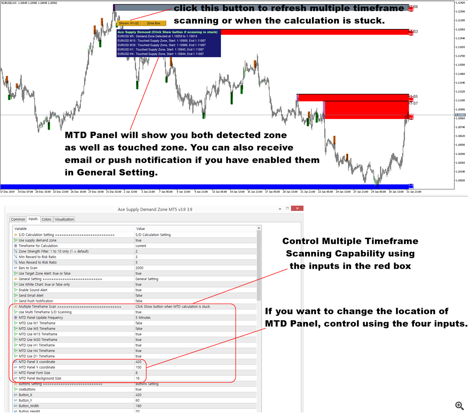 اگر ایمیل یا اعلان فشاری را در ورودیهای زیر تنظیمات عمومی فعال کرده باشید، میتوانید هشدار منطقه عرضه و تقاضای شناسایی شده و همچنین منطقه عرضه و تقاضا را لمس کنید. چیزی که باید در مورد اسکن تایم فریم چندگانه بدانید این است که برای هر بازه زمانی به چندین محاسبات نیز نیاز دارد. وقتی تایم فریم های M1 تا D1 را فعال کنید، محاسبات می تواند تا 7 بار یا بیشتر سنگین تر باشد. از این رو، به دلیل مشکلات بارگیری داده ها، ممکن است گاهی اوقات محاسبه گیر کند. در این صورت، فقط روی دکمه Show کلیک کنید تا تمام محاسبات به روز شوند. البته، اگر میخواهید فقط یک تایم فریم معامله کنید، میتوانید اسکن چند تایم فریم را خاموش کنید.