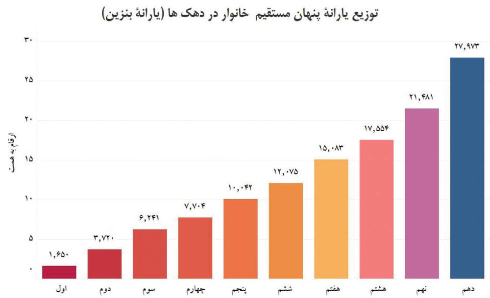 دوم، بهره مندی به مراتب بیشتر افراد ثروتمند از یارانه پنهان است. چرا که در موضوع یارانه پنهان، افرادی که بیشتر مصرف کنند، بیشتر از این تخفیف و یارانه پنهان بهره مند می شوند. افرادی که 2 یا 3 خودرو دارند، بنزین بیشتری مصرف می کنند. افرادی که منزل بزرگ و لوکس دارند، برق بیشتر و صاحبان استخرهای خانگی، آب بیشتری مصرف می کنند و در نتیجه از یارانه پنهان بیشتر بهره مند می شوند و افراد دهک های پایین درآمدی که مصرف به مراتب کمتری دارند، کمتر از یارانه پنهان بهره مند می شوند.