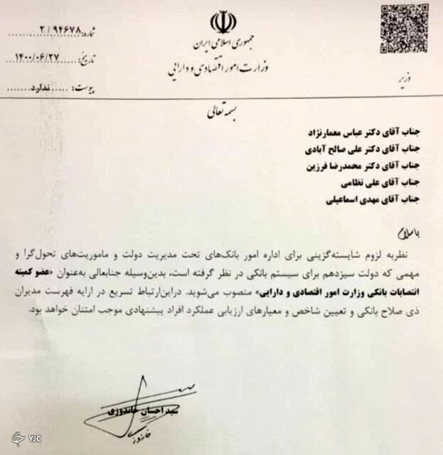 در متن حکم خاندوزی آمده است: «نظر به لزوم شایستهگزینی برای اداره امور بانکهای تحت مدیریت دولت و ماموریتهای تحولگرا و مهمی که دولت سیزدهم برای سیستم بانکی در نظر گرفته است، بدینوسیله جنابعالی به عنوان «عضو کمیته انتصابات بانکی وزارت امور اقتصادی و دارایی» منصوب میشوید. در این ارتباط تسریع در ارائه فهرست مدیران ذیصلاح بانکی و تعیین شاخص و معیارهای ارزیابی عملکرد افراد پیشنهادی موجب امتنان خواهد بود.»
