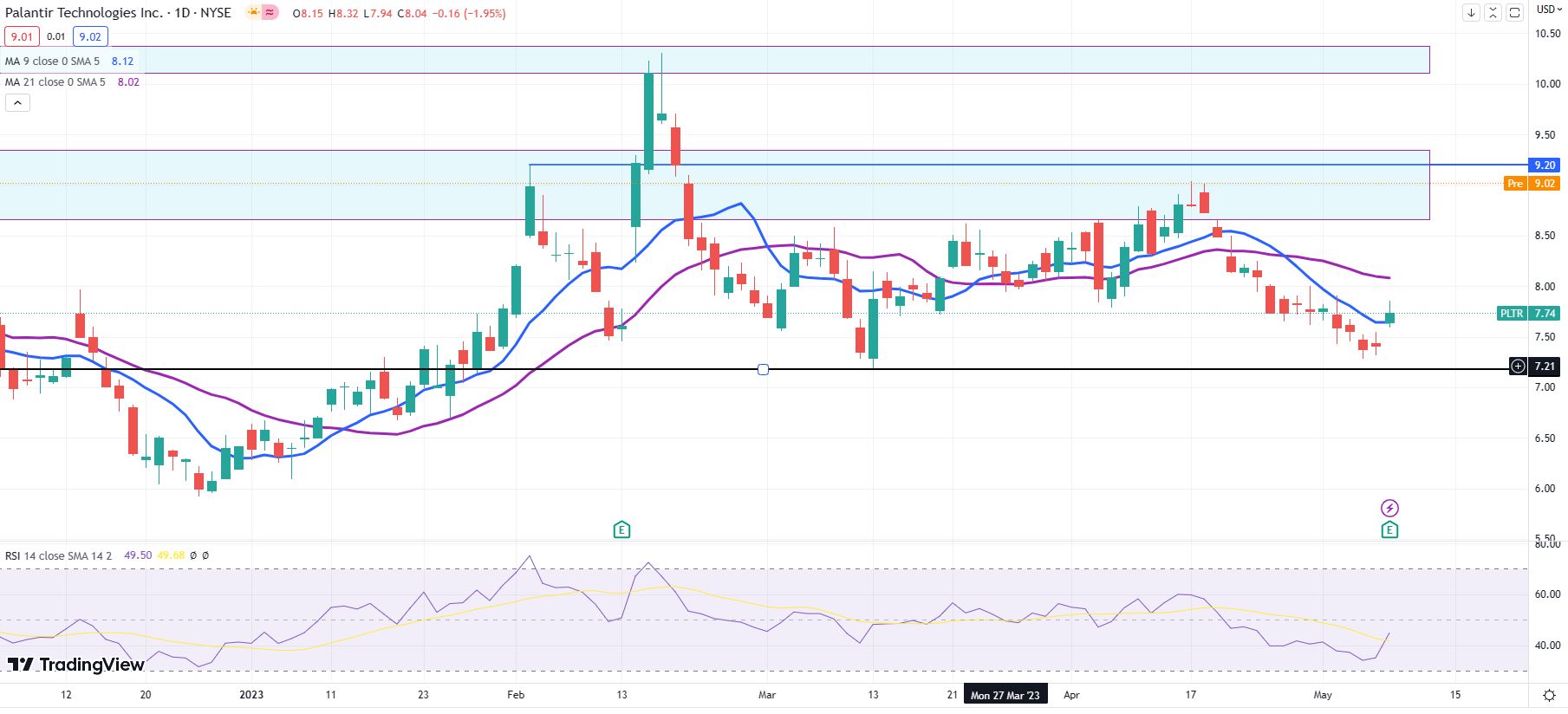 به نظر می رسد سهام PLTR بار دیگر در نزدیکی نقطه مقاومتی که در 17 و 18 آوریل با آن مواجه شده بود، در حدود 9 دلار است. در 2 فوریه شاهد کاهش قیمت PLTR با قیمت 9.20 دلار بودیم و ما قبلاً بالاترین محدوده را با قیمت 9.35 دلار ذکر کردیم. این به این معنی است که مکانهای زیادی برای معاملهگران وجود دارد که در نزدیکی سربار سود خود را ثبت کنند، که میتواند افزایش مجدد را بعید کند. با این حال، بسته شدن روزانه بالای 9.35 دلار به گاوها این امکان را میدهد تا در محدوده مقاومتی 10.10 تا 10.37 دلاری که در تابستان گذشته مجدداً سقف قیمتی را اعمال میکرد، حرکت دیگری را انجام دهند.
