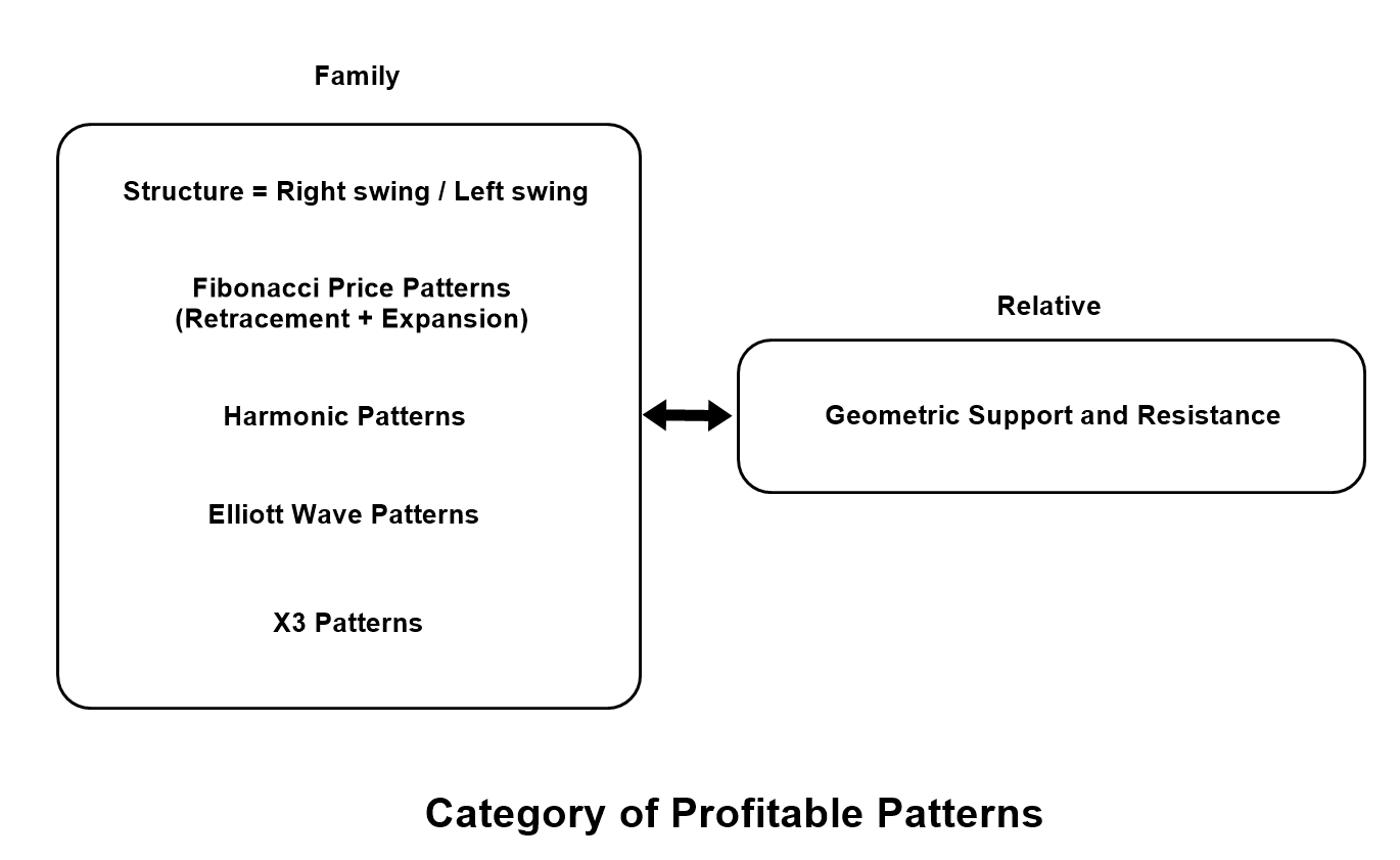 از این رو، الگوهای قیمت فیبوناچی (الگوهای کاهش و گسترش)، الگوهای هارمونیک، الگوهای موج الیوت و الگوهای X3 از این نظر خانواده هستند. همانطور که در کتابم نوشته ام، حمایت و مقاومت هندسی خویشاوندی خانواده است.