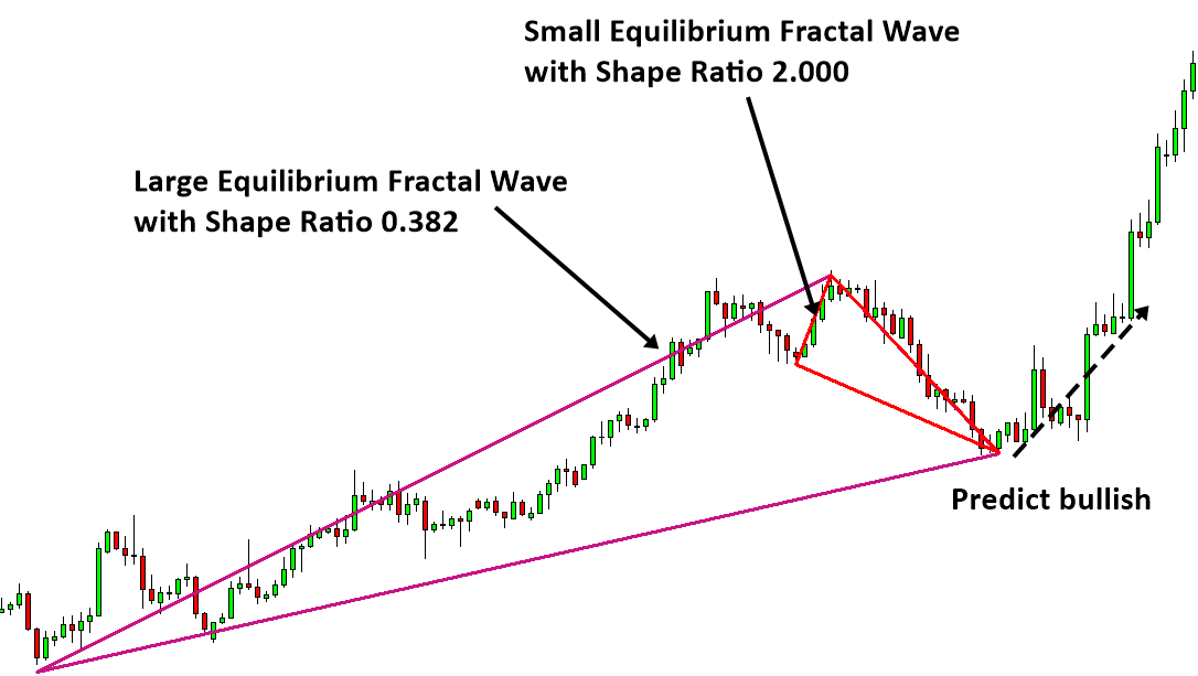 سومین ویژگی موج فراکتال تعادلی این است که امواج فراکتال تعادلی کوچکتر می توانند با هم ترکیب شوند و یک موج فراکتال تعادلی بزرگتر را تشکیل دهند. این ویژگی سوم اغلب توسط یک معامله گر حرفه ای برای بهبود قابلیت پیش بینی بازار مالی استفاده می شود. به عنوان مثال، به جای معما کردن با مجموعه ای از امواج فراکتال تعادلی کوچک، معما کردن با امواج فراکتال تعادلی کوچک و بزرگ برای پیش بینی جهت بازار بسیار دقیق تر است. اکنون چند نمونه از پیش‌بینی معکوس خود را با استفاده از این امواج فراکتال تعادلی روی هم نشان می‌دهیم. در شکل 3-23 و شکل 3-24، یک موج فراکتال تعادلی بزرگ با یک موج فراکتال تعادلی کوچک همپوشانی دارد. می‌توانیم پیش‌بینی معکوس صعودی را پس از تکمیل آخرین کندل انجام دهیم. پیش‌بینی بر اساس دو موج فراکتال تعادلی می‌تواند احتمال پیروزی نهایی را تنها با استفاده از یک موج فراکتال تعادلی افزایش دهد.