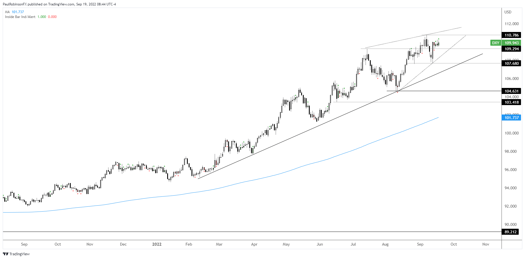 از نقطه نظر فنی، روند صعودی است و به نظر می رسد شاخص دلار آماده شکستن از بالاترین سطح اخیر در 110.78 است. این که آیا این قبل از فدرال رزرو اتفاق می افتد یا بعد از فدرال، البته باید دید. در هر صورت، روند تغییرات زیادی را به همراه خواهد داشت، اما میتوانیم شاهد تضعیف DXY در کوتاهمدت قبل از افزایش آن باشیم.