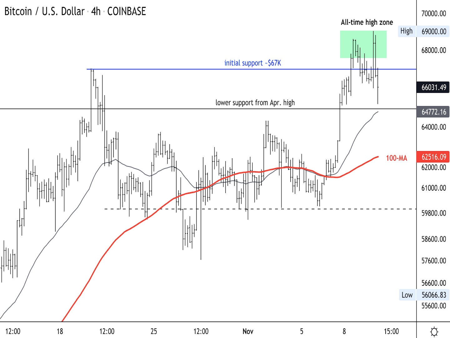 بیت کوین از بالاترین سطح خود عقب نشینی می کند، پشتیبانی بین 63 تا 65 هزار دلار