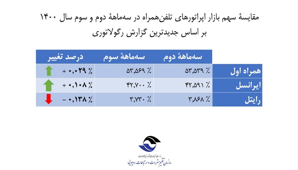 بر اساس گزارش رگولاتوری، در سه ماهه سوم سال ۱۴۰۰، تعداد مشترکان فعال همراه اول ۷۲۷۹۴۸۱۶ مشترک، مشترکان فعال ایرانسل ۵۸۰۲۵۳۰۳ مشترک و مشترکان فعال رایتل نیز ۵۰۶۹۳۰۵ مشترک بوده است.