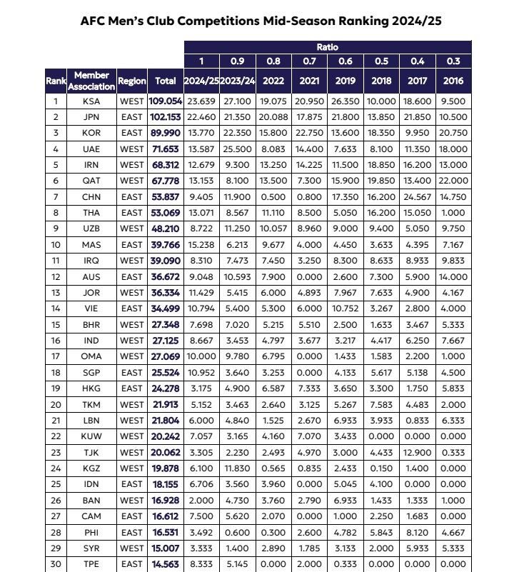 ایران در این رنکینگ ۶۸.۳۱۲ امتیاز به دست آورده و با ۰.۵۳۴ امتیاز بیشتر از قطر، در جایگاه پنجم قرار گرفته است. بیشترین امتیاز ایران در هشت فصل اخیر، به سال ۲۰۱۸ برمیگردد که پرسپولیس به فینال لیگ قهرمانان آسیا صعود کرد و استقلال و ذوبآهن به ترتیب تا مراحل یکچهارم و یکهشتم نهایی این مسابقات بالا آمدند.