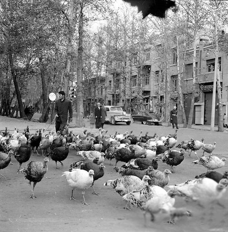 ارامنه به واسطه ذکاوت و درستکاری خود طوری پیش افتادند که هیچ رشته تجارتی نبود که در آن وارد نشده باشند. یکی از این زمینهها تجارت بوقلمون بود، اما کمکم به دلیل سود خوب این کار برخی از اهالی تهران هم این کار را یاد گرفته و مشغول پرورش بوقلمون شدند. این تصویر مربوط به سال ۱۳۳۸ در یکی از خیابانهای تهران است که بوقلمونها آزادانه در حال قدم زدن در شهر هستند.