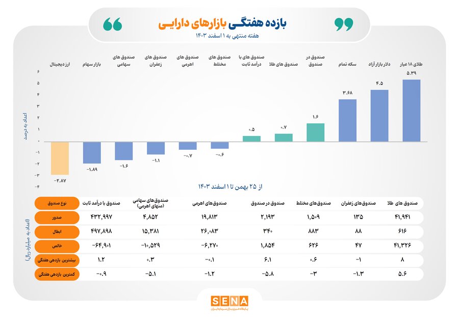 به گزارش خبرنگار پایگاه خبری بازار سرمایه ایران(سنا) ، طبق دادههای آماری محاسبه شده در مرکز نظارت بر صندوقهای سرمایهگذاری و همچنین اداره تحلیلهای اقتصادی و ریسک سازمان بورس، در هفته منتهی به یک اسفند ۱۴۰۳، سه ابزار سرمایهگذاری بورسی؛ شامل: فراصندوقها «(صندوق در صندوقها)»، «صندوقهای طلا» و «صندوقهای در اوراق بهادار با درآمد ثابت»، به ترتیب با کسب ۱.۶۱، ۰.۷، ۰.۵ درصد بازده مثبت، جایگاه سوم تا ششم جدول ردهبندی بازارهای دارایی هفته پایانی بهمن ماه را به خود اختصاص دادند.